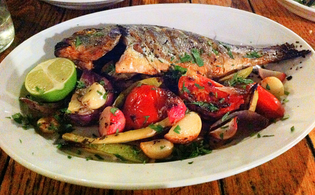 המשכנו לעיקריות שם אני בחרתי דג שלם על ירקות חרוכים בתנור (110 שקלים). הגיע לי דג דניס טרי ששכב פרקדן על ים ירקות צבעוניים. זה היה פשוט טעים ויחסית קל אחרי כל מה שאכלנו לראשונות, ועם הבריזה של הים וכוס היין שלי זה היה מושלם.