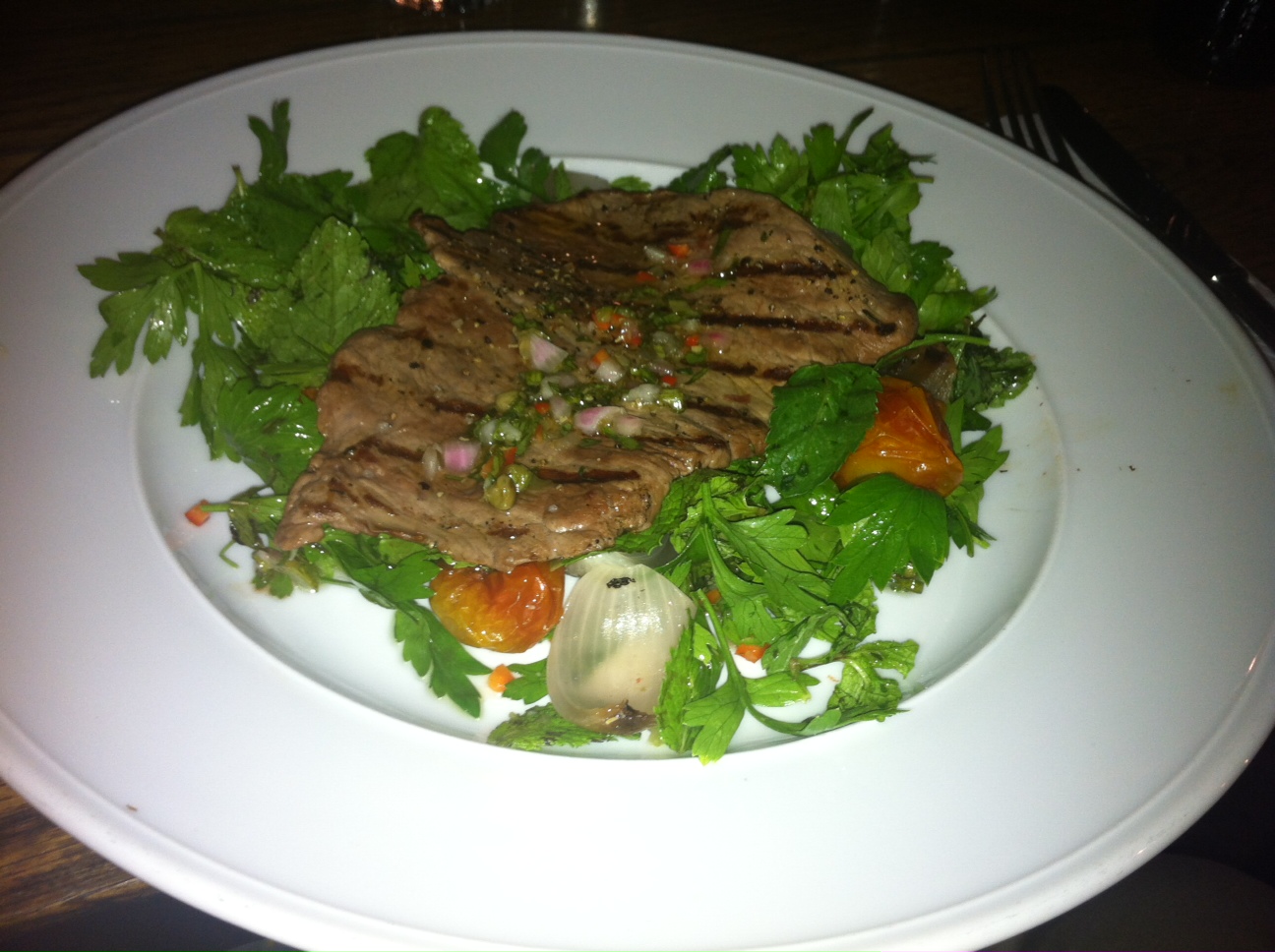 מנה ראשונה נוספת לקחנו מהספיישלים: סטייק דקה - נתח אנטריקוט דק ומיושן היטב העשוי דקה בלבד על האש ומוגש על מצע עלים ירוקים ועגבניות חרוכות (48 שקלים). גם הסטייק היה מצויין, עשוי בול במידה (לא שכחו אותו על האש) והמנה נדיבה ויפה.