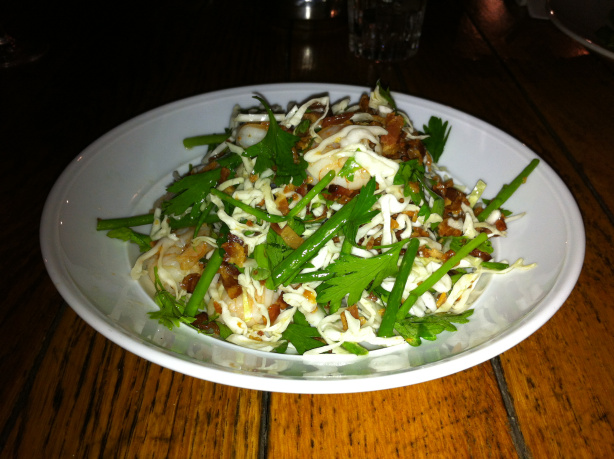 התחלנו בשתי מנות ראשונות: סלט שרימפס שהיה מעולה והורכב מכרוב, כמויות לא מבוטלות של שרימפס ולא מעט בייקון (64 שקלים). ביקשנו אותו ללא הצ'ילי ובאמת זה לא היה חסר. הכמות הספיקה לשלושה אנשים, אם סופרים את זה כמנת פתיחה. לדעתי זה גם יכול לבוא בקלות לעיקריות אם את מנשות הסלט הקוקטיות.