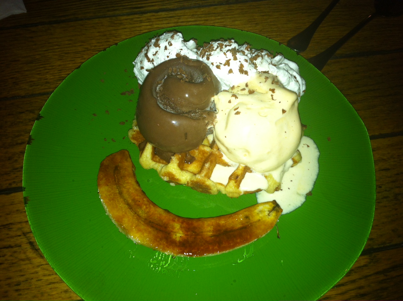 לקינוח הסתערנו על הוופל הבלגי (40 שקלים) שהוגש עם שני כדורי גלידה ובננה מקורמלת ואפילו י' שידוע בפי כל שאינו מחובבי המתוק לא היה יכול להתאפק ונתן עבודה. זה היה פשוט מתוק וטעים, אין מילים אחרות לתאר את זה.