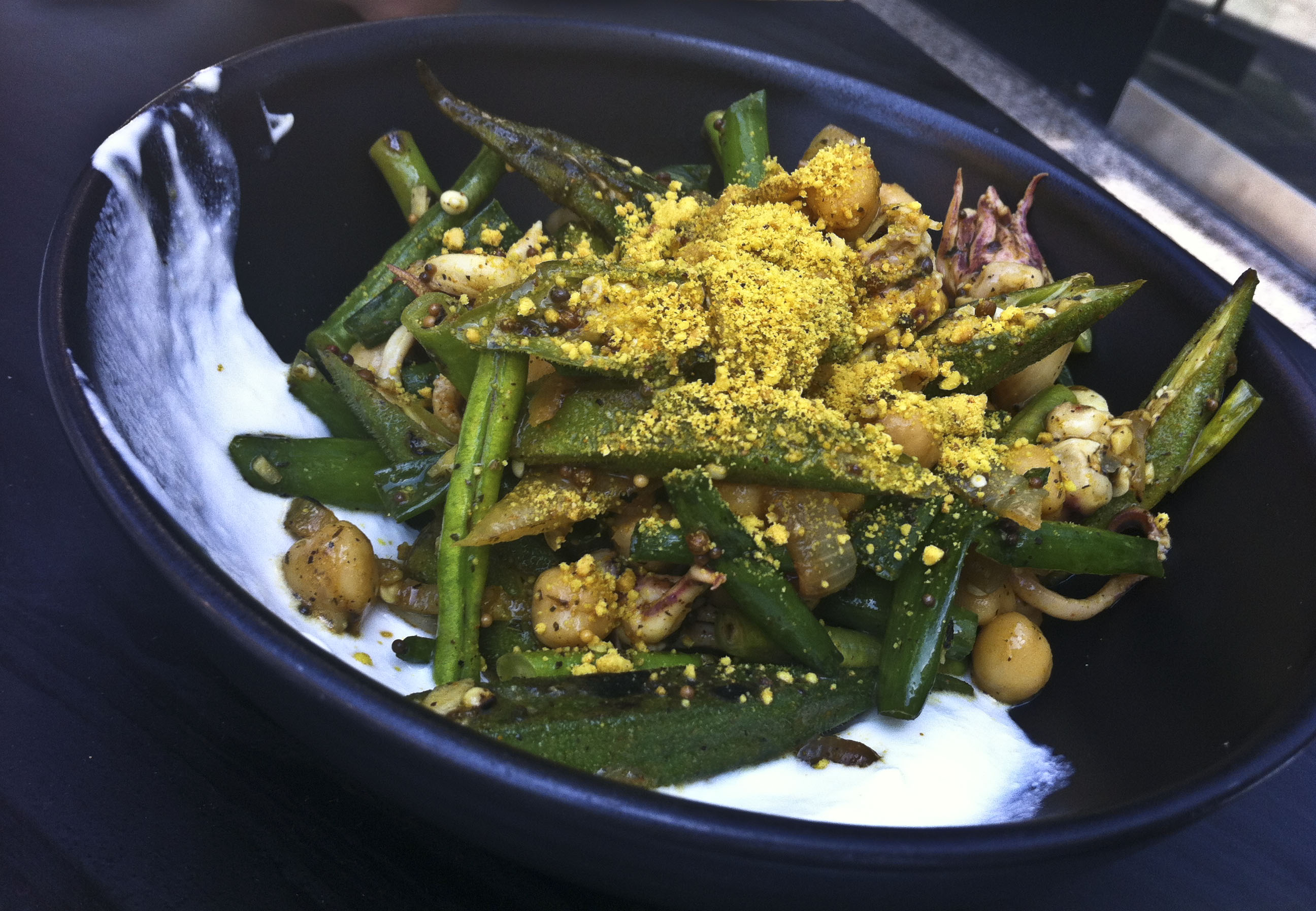 משם המשכתי לסלט חומוס בולגרי שהיה מורכב מגרגירי חומוס, במיה, מנגו בוסר, ראשי קלמרי ויוגורט באפלו חריף. הסלט היה מצוין בזכות עושר המרכיבים שלו והשילוב הייחודי. היתה בו חמצמצות שעשתה יופי לקלמרי והדגישה את הטעמים של כל שאר המרכיבים, ולמרות שלא מצאנו קשר בין המנה לקו האסייתי של המסעדה (כן אני יודעת שבבישול ההודי משתמשים הרבה בחומוס, יוגורט ומנגו אבל גם בבישול במג'דל שאמס).