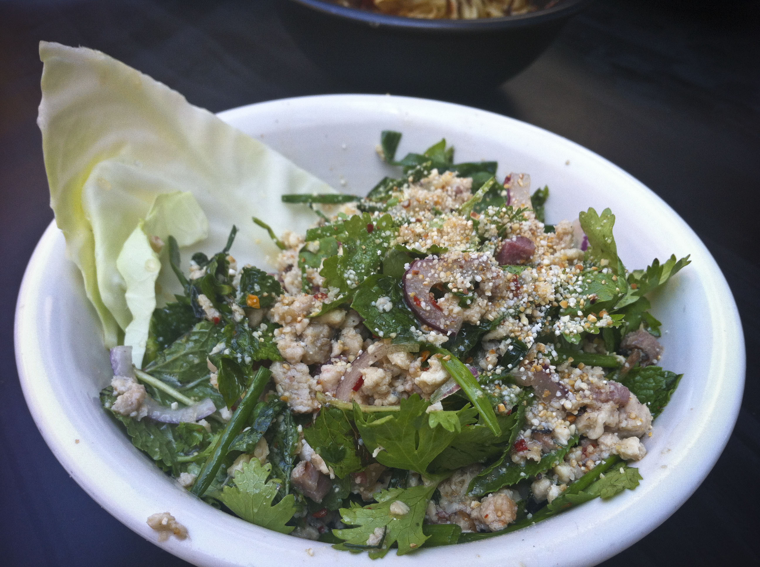 משם המשיך י' למנה ראשונה נוספת "לאב גאי אווז" - פרגית קצוצה, חזה אווז מעושן, כוסברה ונענע, בצל סגול, צ'ילי קשמירי, קריספי רייס. גם זו היתה מנה טובה, מין סלט קר עם בשרים, חריף מעט, עשיר בטעמים ומורכב. הרוטב הזכיר את הרוטב מהמנה הקודמת וחיזק את כל הטעמים ואת השילוב של הנענע והכוסברה נפגוש גם בהמשך.