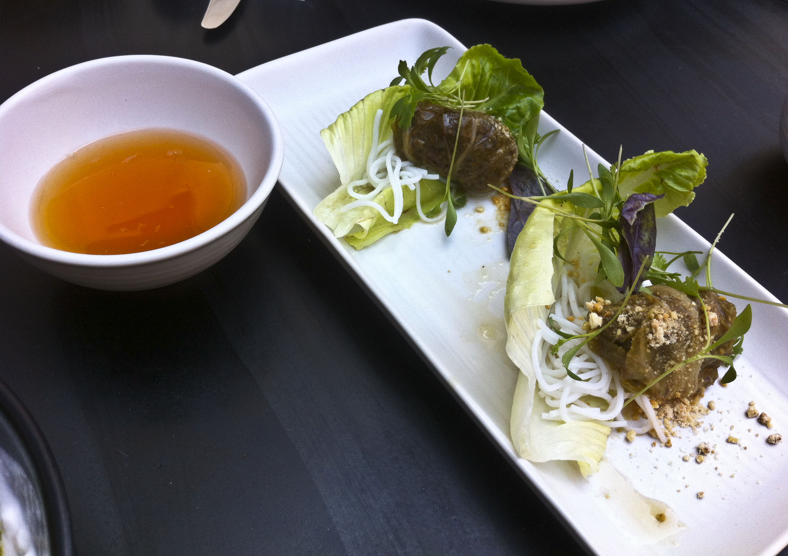 מכאן עברנו למנות הפתיחה עצמן. י' לקח שתי מנות בשריות שהדגישו את גבריותו והתחיל בכרוב סיני ממולא עם בשר שפונדרה, פלפל לבן, אניס, למון גראס, פיש סוס (רוטב דגים) ואבקת בוטנים. זו מנה קלילה ומצויינת והטעמים שבלטו בבשר היו אניס וחלב קוקוס. בצד הגיע רוטב חמוץ-חריף מפיש סוס, ליים, צ'ילי וסירופ סוכר. המנה היתה מצוינת ומדויקת וכל הטעמים התחברו נפלא.