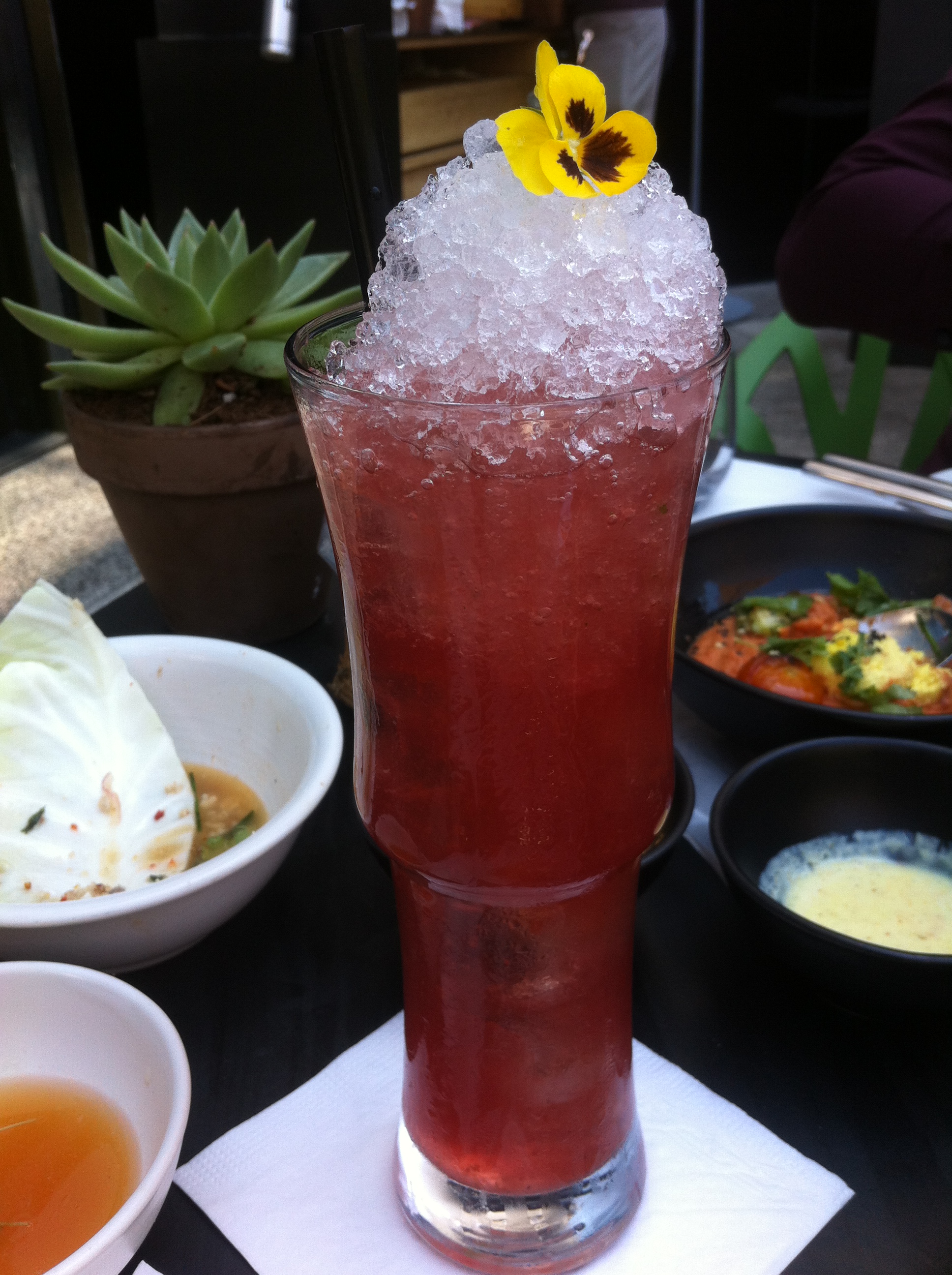 לפני הסטארטרס קיבלנו חמוצים שכללו גזר, מלפפון, צנונית וג'ינג'ר שהיו קריצה חביבה לסיניות של שנות ה-80 אך לא מעבר. כדי שלא תיבש לנו החיך קיבלנו חליטת תה יסמין עדינה ומתקתקה שהוגשה בבקבוק מקסים ומעוצב והלכה יופי עם כל האוכל שמסביב, ויחד עם המנות הראשונות תקבלו סטיקי רייס- זוהי קוביית אורז תאילנדי דביק מאודה עם שומשום, הצבע הוא סגול והקובייה בכוונה חסרת טעם מתוך כוונה שתוכלו להעשיר איתה את המנות והיא בתמורה תספוג את הטעמים שלהן. הכי win win situation.