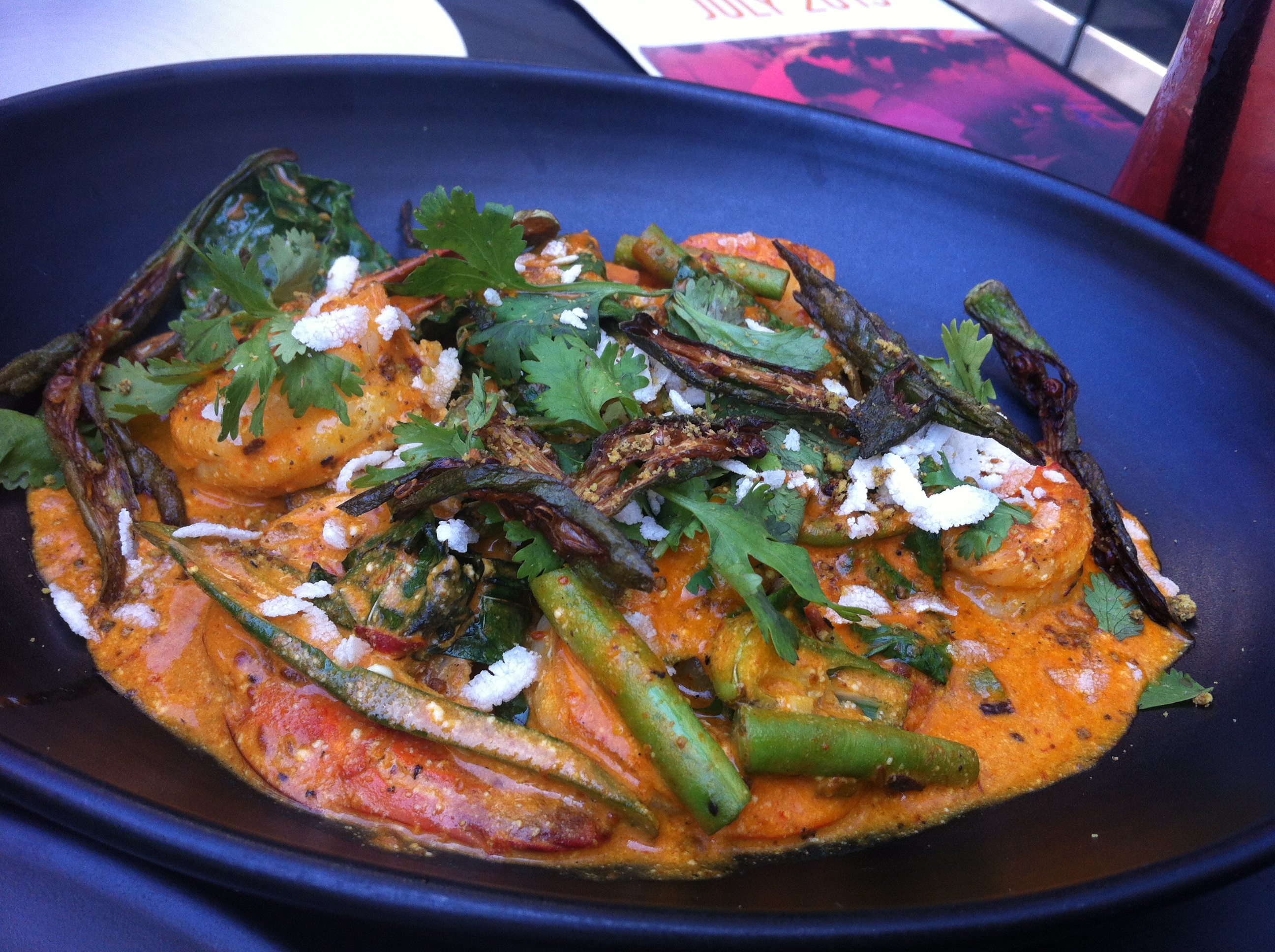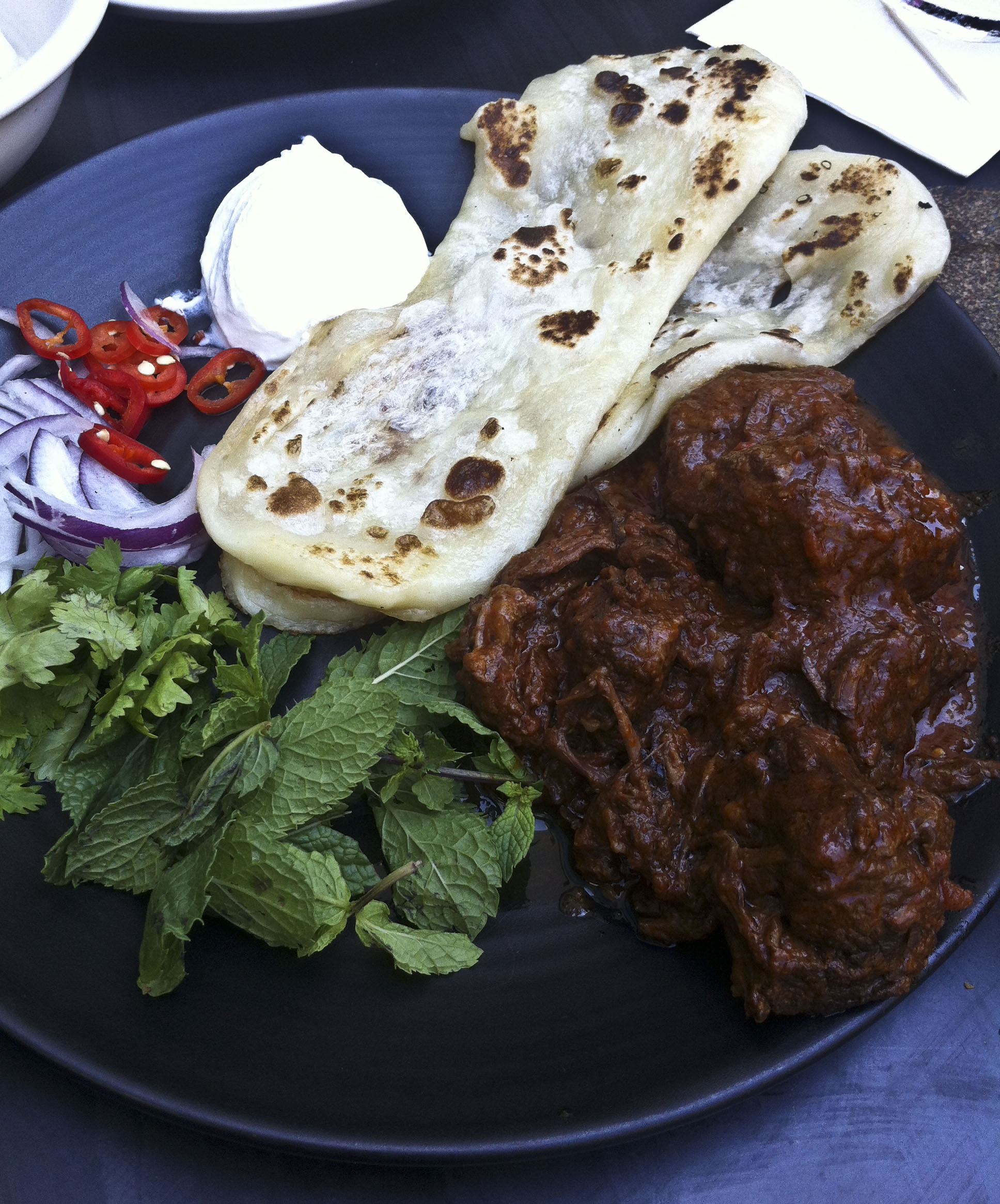 לעומתי י' לקח "וינדאלו" שזה בשר אונטריב שעבר בישול ארוך בעגבניות עם מגע של דבש. הבשר מלווה בפראטה (סוג של לחם הודי), שמנת חמוצה, בצל סגול, פלפל חריף, כוסברה ונענע בצד. המנה היתה טובה וכיפית. הבשר היה רך מאוד והרגישו את הדבש וכל התבלינים שלו. הלחם היה פחות מוצלח כי הוא לא היה אפוי בצורה אחידה. השוליים שלו היו עבים מדי ולא מספיק אפויים ובאמצע הוא היה דק מדי, אבל לא נורא. גם ככה פחמימות זה רצח. הבשר לכשלעצמו והירקות מסביב עשו את העבודה.