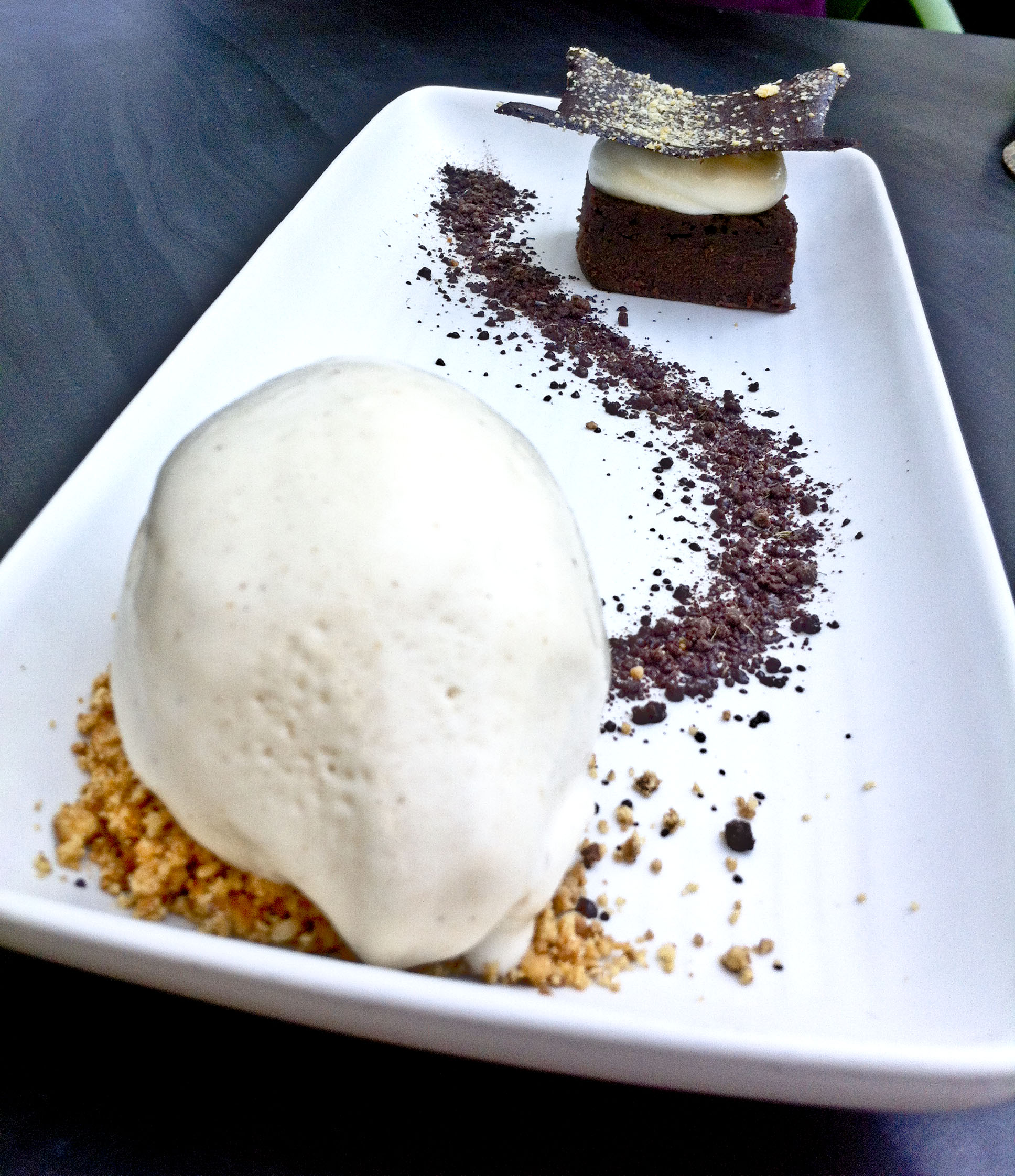 לקינוח לקחנו פגודה שוקולד שהיתה מעל הציפיות. לפי התיאור של המלצר זה היה בראוני מעליו מוס לבן וכדור גלידה בצד. כשהוא אמר את זה אני נחרתי בבוז שזה נדוש, אך כשזה הגיע זה באמת היה עילוי. הבראוני היה משוקולד מריר מעולה עם מגע של הל ירוק, הוא היה רך ונימוח בצורה מושלמת. מעליו היה מוס שוקולד לבן בנגיעה ומעל הכל- גג הפגודה שהתגלה כדף ופל שוקולד פריך. כדור הגלידה עשוי היה מקשיו וחמאה חומה והמלצר גילה לי שבערב זה מוגש כפול- בשתי קומות, מה שגרם לנו להבטיח לעצמנו שאין ברירה, אבל חייבים לחזור לעוד סיבוב מהנה גם בערב לגלות את התפריט הנוסף עם כל המנות שטרם ניסינו ובכלל.