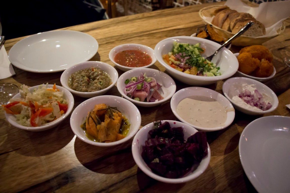 לפני הכל קיבלנו מבחר סלטים מפנק שכלל הרינג ביתי, איקרה מצויינת שהתפצפצה בפה, חוסלה במהרה ומיד ביקשנו תוספת, כרובית וחצילים מטוגנים מצופים בפירורי לחם, סלט סלק עם סלרי, טחינה פשוטה וטובה ועוד סלטים כשהכל ממש ממש טרי. עוד משפחות וזוגות היו מסביבנו והאווירה היתה נעימה ויוקרתית והשירות היה מקצועי ומהיר.