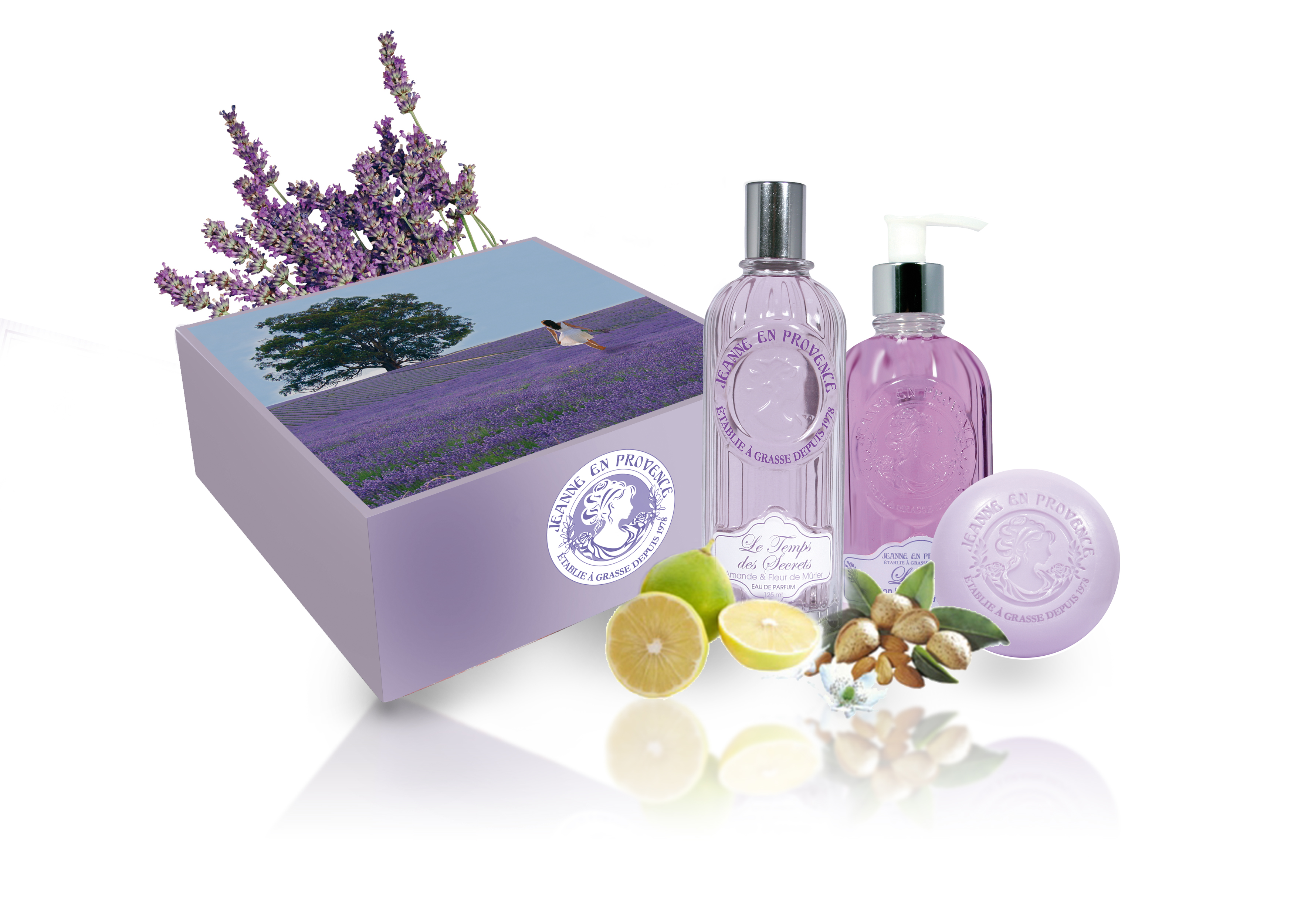 בסדרה: בושם ג'ין פרובנס שקדים ולבנדר או דה פרפיום, סבון נוזלי לבנדר נוסח מרסיי המכיל 100% תמצית שמן זית טהור ותמציות צמחים המטפחות ומבשמות את עור הידיים. מוצר אקולוגי מתכלה, אינו מכיל פראבנים או שומן מהחי. סבון מוצק לבנדר עשיר בתמצית שמן זית צמחית ומיצוי מפריחת שיחי לבנדר. מופק בשיטת הייצור המסורתית המקובלת בחבל פרובנס מזה מאות שנים וקרם רגליים טיפולי לבנדר.
