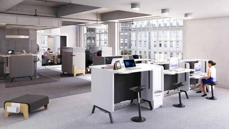 מערכת Stand-Up -פינת עבודה משרדית המאפשרות מעבר מהיר ויעיל בין מצב ישיבה למצב עמידה. המערכת מתחשבת במגוון הצרכים המשרדיים שלנו בעבודה, כך שניתן בקלות להפוך את חלל העבודה המשותף לחדר ישיבות. המערכת מאופיינת בקווי עיצוב פשוטים ונייטרלים המעניקים תחושת קרבה וחמימות בין יושבי המשרד. משטח העבודה המתכוונן מעוצב בגימור של פינות עגולות למניעת פציעות וחבלות בעת השימוש במנגנון הכוונון.