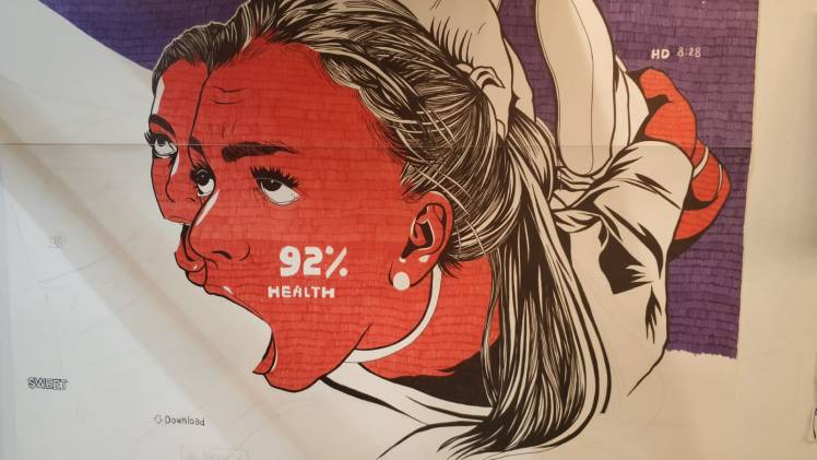 לאחר מכן אני מייצר רפליקה של אותם דימויים במרחב הציבורי על פני משטחים גדולים כגון דלתות ברזל, קירות בטון, זכוכית ופלסטיק, ומשתמש בטכניקה של צבעי ספריי וצבעים אקריליים.