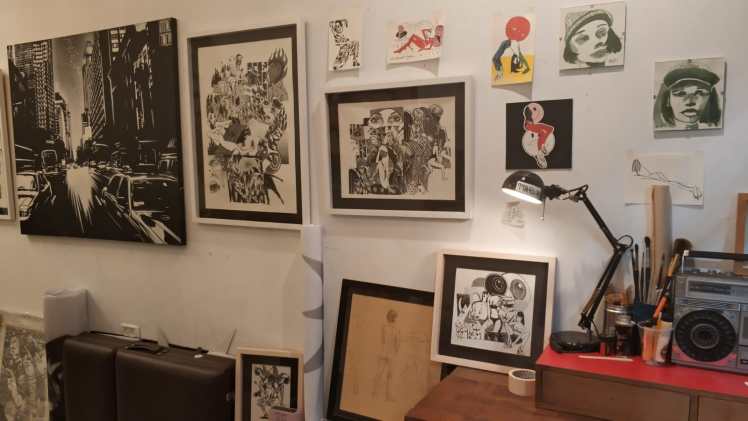 תהליך היצירה מתחיל מעבודה בסטודיו וכולל שימוש בנייר, הדפסי זירוקס, טושים, עטים ודיו.