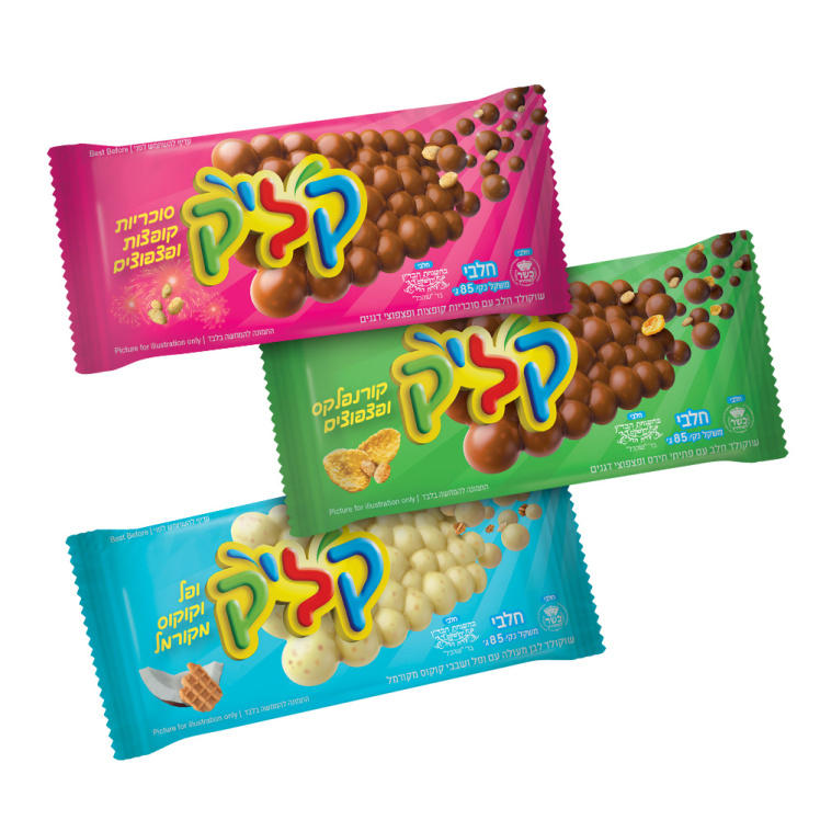 קליק קורנפלקס ופצפוצים–בהשראת הטעם האהוב של קליק בשקית: טבלה שכוללת שוקולד חלב עם פתיתי תירס ופצפוצי דגנים.