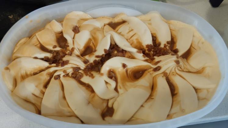 אקלר טופי קרמל – גלידה משפחתית בטעם אקלר בתוספת סוכריות קרמל וסירופ ריבת חלב.