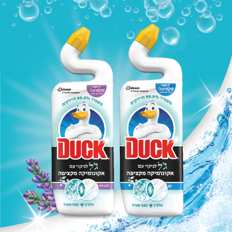 המותג הבינלאומי DUCK לניקוי השירותים, משיק מוצר חדשני המשלב שתי פעולות משלימות: ג'ל לניקוי האסלה בתוספת אקונומיקה מקציפה השומרת על האסלה מנצנצת ומבריקה, מבושמת ולבנה בשני ניחוחות ייחודיים: לבנדר וים שיצטרפו לעוד כ-18 מוצרי דאק המוצעים כיום.