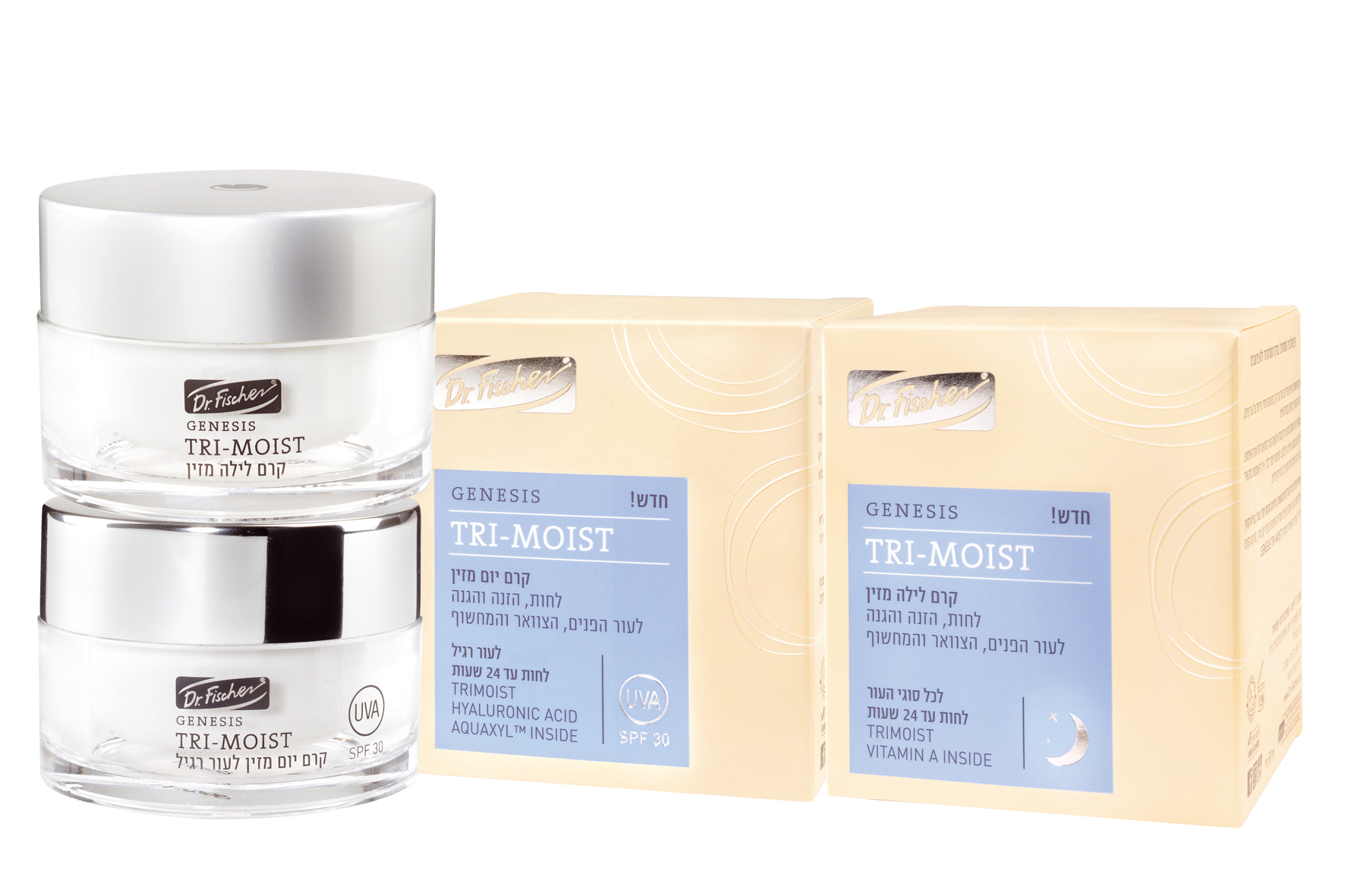 ד"ר פישר GENESIS TRI-MOIST היא סדרת תכשירים מתקדמת בעלת פעילות משולשת: לחות, הזנה והגנה גבוהה ורחבה מקרינת השמש. הסדרה מכילה קומפלקס לחויות ייחודי המשלב את הרכיב המתקדם והפעיל TRIMOIST היוצר שכבת מגן המסייעת במניעת איבוד לחות, מעשיר את העור במרכיבי לחות ושומר על מאזן הלחות הטבעי של העור. התכשירים מועשרים בקומפלקס לחויות בשילוב פרו-ויטמין B5 לריכוך, הזנת העור ולשמירה על גמישות וחוזק העור ואנטי-אוקסידנט ויטמין E, להגנה מפני רדיקלים חופשיים ונזקי סביבה ואקלים ולמראה עור חלק וקורן יותר.