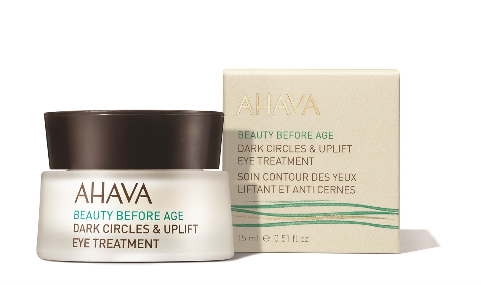 קרם העיניים החדש של AHAVA מספק תועלות מגוונות: עם מרקם קליל אך עשיר הנספג במהירות הוא ממצק, מפחית נפיחות ומבהיר עיגולים שחורים, מחליק קמטים, מלחלח ומזין את אזור העיניים, מחייה, מחדש ומתקן סימני הזדקנות ועייפות נראים לעין. הקרם מועשר בחומרים פעילים הכוללים הממליס, סנטלה אסיאטיקה ותמצית תמרים יחד עם פפטידים הפועלים לצמצום עיגולים שחורים.