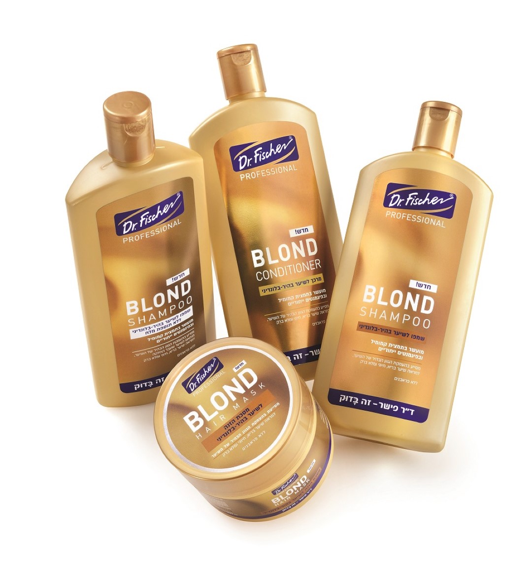 סדרת ד"ר פישר PROFESSIONAL BLOND כוללת שמפו, מרכך, שמפו ללא תוספת מלח המתאים לשיער שעבר החלקה ומסכת הזנה לשיער.