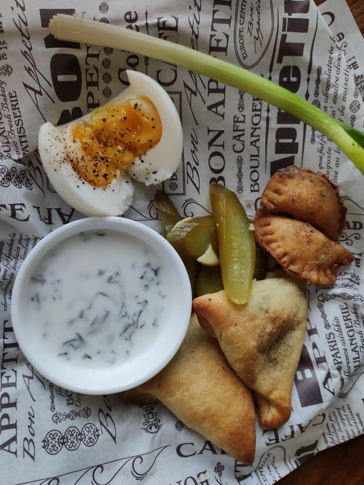 יפו של פעם- שני מאפים עם תרד ושניים עם גבינה לצד מלפפון חמוץ, בצל ירוק, ביצה קשה וזעתר. הבצק טעים ומדוייק, המילוי מעניין ומתובל בצורה מעודנת, והתוספות הופכות את הכל להרגשה של בבית. טוב, אני גרה ביפו אז זו לא חכמה.
