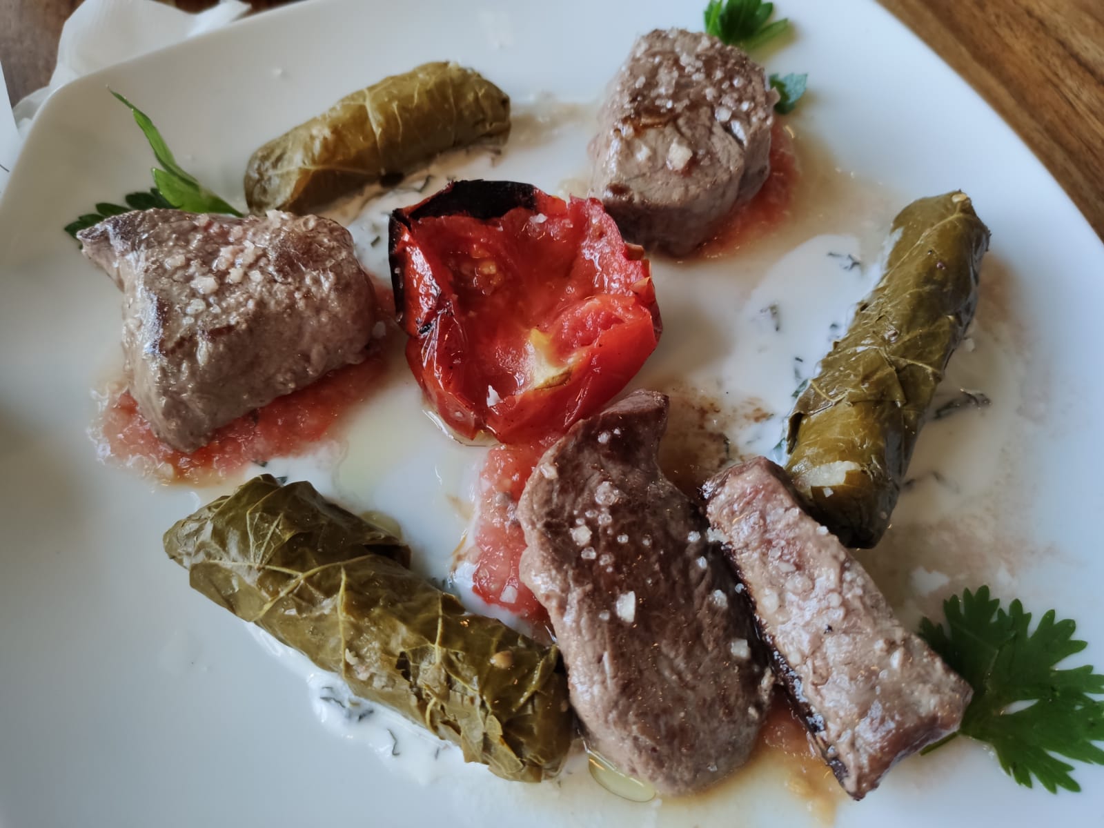 נתח של קצבים- ארבעה נתחים של סינטה, חצי היה וולד אן לצערי ושניים מדיום כמו שצריך. לצד זה הגיעו עלי גפן שנמסים בפה עם רוטב יוגורט בצד שעשה קסמים בחיך. לצד המנה הזו הזמנתי כוס יין ריוחה, יין אדום יבש מהזן האהוב עלי. איזה כיף! הנה נעים לי בכל הגוף והחיוך גדל ומתרחב.