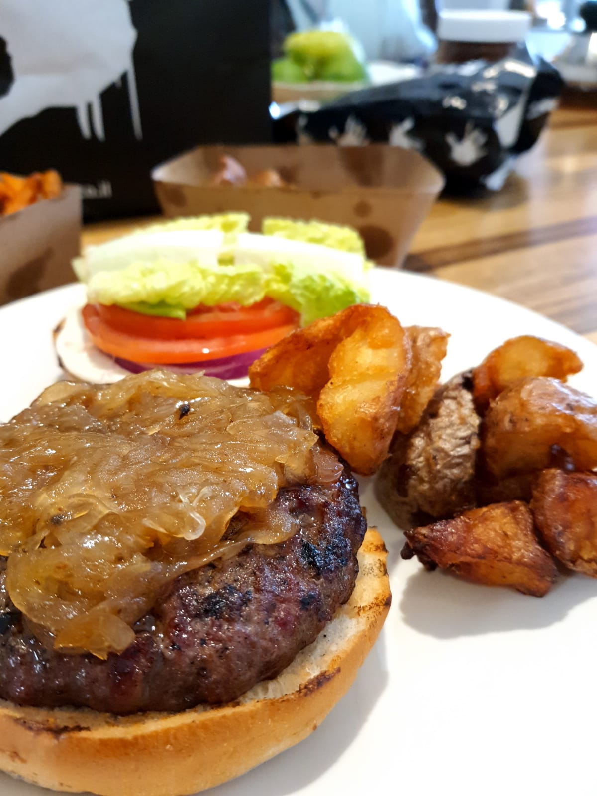 *אסאדו בורגר/או בפיתה מעושן בתוספת סלט כרוב קונפי שום, מוגש בצד עם חסה עגבנייה, בצל, קטשופ, מיונז, וסלט כרוב. פה תקבלו המבורגר שבמקום קציצה- יש בשר מפורק עם אותו טעם מעושן, וכמות מאוד גדולה ומכובדת. הבשר רך, הנתח איכותי ולא תמצאו פה חלקים "לא טובים". הרכות של הכל ביחד עם הלחמניה הנכונה הופכת את זה לביס מושלם.