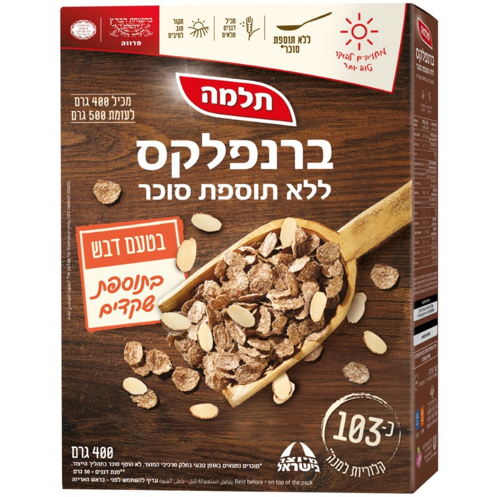 מה הקטע: תלמה ממשיכה לחדש ומרחיבה את משפחת ברנפלקס עם ברנפלקס ללא תוספת סוכר בטעם דבש ובתוספת שקדים. אלו דגנים מלאים עשירים בסיבים תזונתיים, ללא תוספת סוכר וכ-103 קלוריות למנה של 30 גר'.