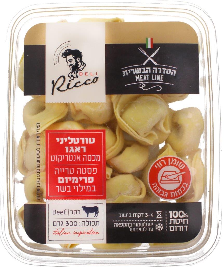 פסטה מצוננת טרייה מ-100% חיטת דורום איכותית, בצורת טורטליני במילוי בשר בקר מכסה אנטריקוט. הפסטה עשויה מחומרי הגלם הטובים ביותר, בעלת אחוז חלבון גבוה בקמח, אינה מכילה חומרים משמרים, צבעי מאכל או אבקות.