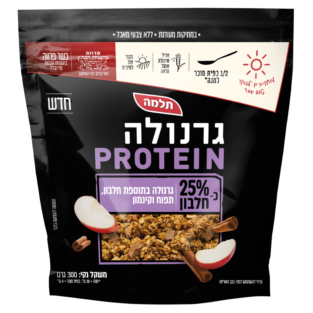 מה הקטע: תלמה מרחיבה את סדרת גרנולה PROTEIN ומשיקה טעם חדש – תפוח וקינמון. הגרנולה החדשה מכילה כ-25% חלבון והיא מצטרפת אל שני המוצרים הקיימים שכבר כבשו את לב הצרכנים והמתאמנים – גרנולה בתוספת אגוזים וגרנולה בתוספת שקדים וחמוציות.