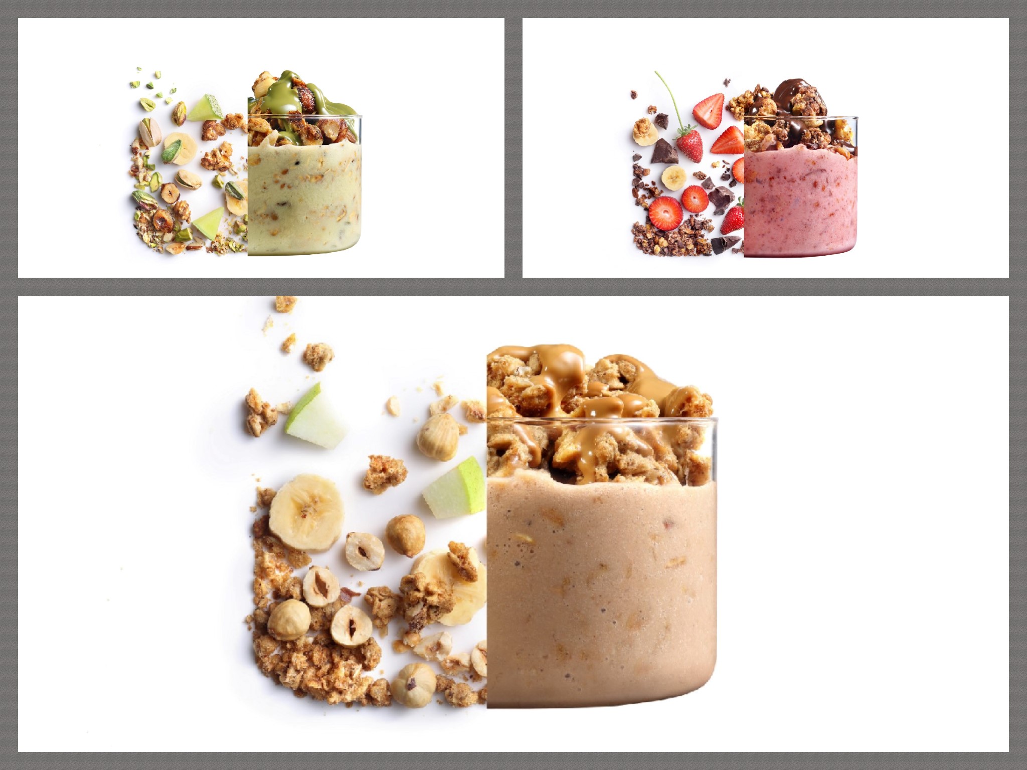 • crunchy pistachy: בננה, מלון, רוטב פיסטוק, קרוקנט אגוזי לוז, חלב, regurt, כולל תוספות לבחירה.